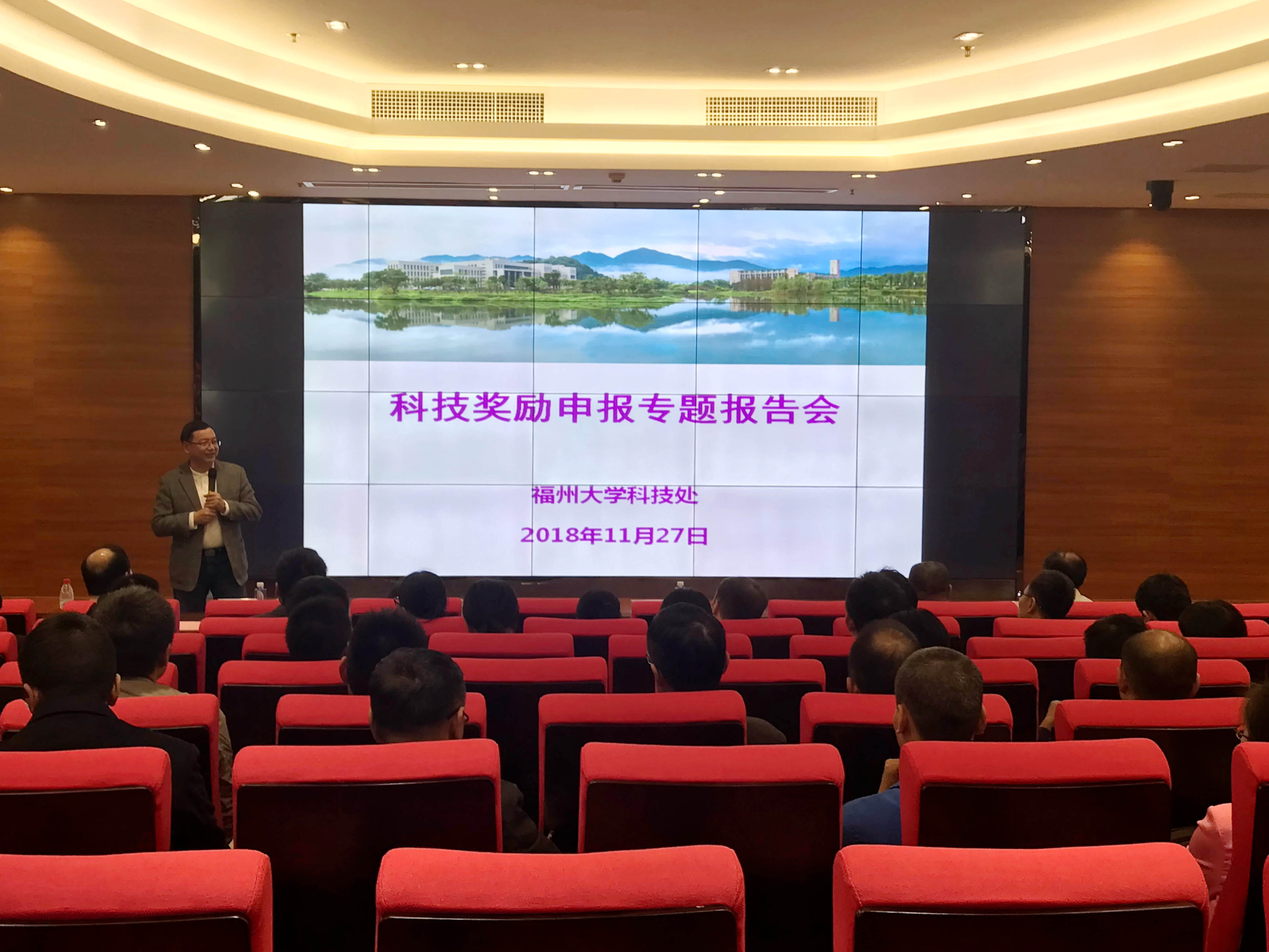 新闻中心讯/11月27日下午,福州大学科技奖励申报专题报告会在科技园召开。福州大学副校长黄志刚,各理工科学院院长、分管科研的副院长、省级以上科研平台负责人、拟申报科技奖励的相关教师等百余人参加了会议。